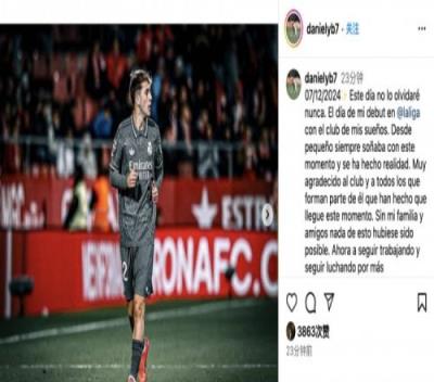 体育资讯12月8日报道宣称 皇马3-0击败赫罗纳的比赛中,17岁小将亚涅斯迎来皇马一线队首秀,赛后球员发文纪念这一时刻。