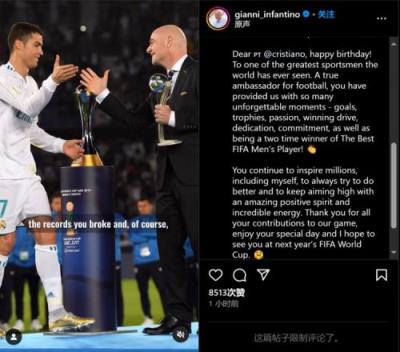 因凡蒂诺写道:亲爱的C罗,生日快乐!向世界上最伟大的运动员之一致敬。作为真正的足球大使,你为我们提供了如此多令人难忘的时刻——进球、奖杯、激情、获胜的动力、奉献、承诺,以及两次当选FIFA最佳球员!