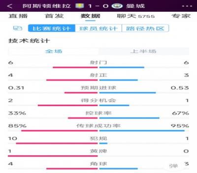 曼城一球落后,维拉vs曼城半场数据:射门66,射正43,犯规101