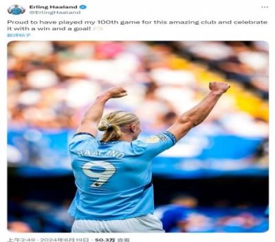 此役是哈兰德为曼城出战的第100场比赛,赛后哈兰德在社交媒体上晒出庆祝的照片,并写道:“我很自豪能为这家了不起的俱乐部出战第100场比赛,并用一场胜利和一个进球来庆祝。”