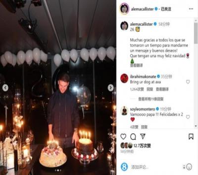 体育资讯12月25日报道宣称 利物浦中场麦卡利斯特昨天迎来了自己的生日,他在社交媒体上感谢大家的祝福。