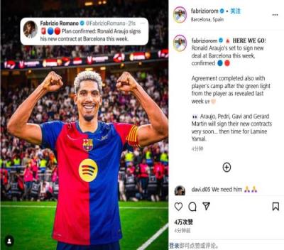 体育资讯01月22日报道宣称 名记罗马诺以标志性的“here we go”宣布,阿劳霍本周与巴萨完成续约。