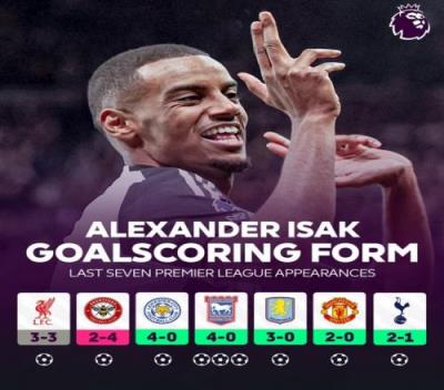 状态火热!伊萨克已经连续7场英超破门,7场共收获9球2助攻