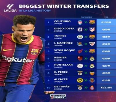 体育资讯1月14日报道宣称 今年的冬季转会窗口已经开启,德国转会市场统计了西甲历史上冬窗最贵引援前十名。其中,巴萨豪掷1.35亿欧引进库蒂尼奥居首,6000万欧加盟马竞的迭戈-科斯塔第二,