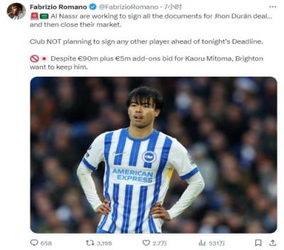 体育资讯2月1日报道宣称 记者罗马诺此前报道,利雅得胜利9000万欧+500万欧浮动报价三笘薰,但被布莱顿拒绝。罗马诺强调了布莱顿希望留下他。这条推文热度超高,并且评论里几乎所有球迷都不理解布莱顿的操作。