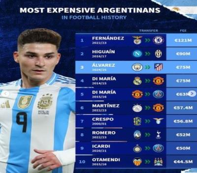阿根廷球员转会费榜:恩佐压伊瓜因居首,克雷斯波00年5680万欧