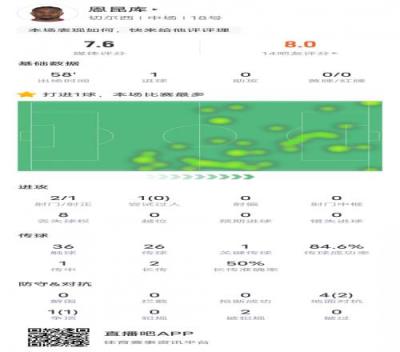 恩昆库本场比赛数据:1进球1关键传球,评分7.6