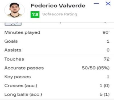 体育资讯8月15日报道宣 皇马在欧超杯2-0击败亚特兰大,巴尔韦德本场数据如下: