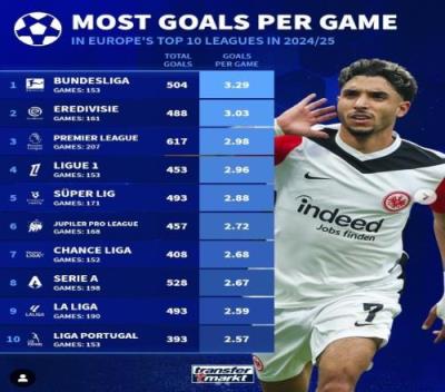 欧洲主流10大联赛场均进球排行:德甲3.29球居首,英超2.98球第三