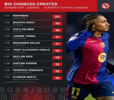 体育资讯1月29日报道宣称 数据机构squawka统计了本赛季五大联赛创造重大机会情况,巴萨边锋拉菲尼亚居首。