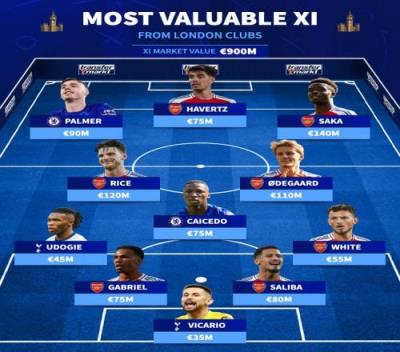 前锋:帕尔默(切尔西)9000万欧、哈弗茨(阿森纳)7500万欧、萨卡(阿森纳)1.4亿欧