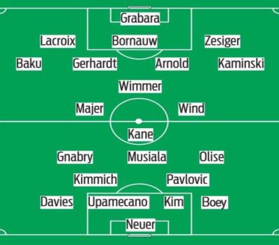 体育资讯8月21日报道宣 北京时间8月25日晚上,拜仁将在德甲首轮比赛中客场对阵沃尔夫斯堡。《体育图片报》预测了拜仁此役的首发阵容,凯恩、奥利斯、基米希在列。