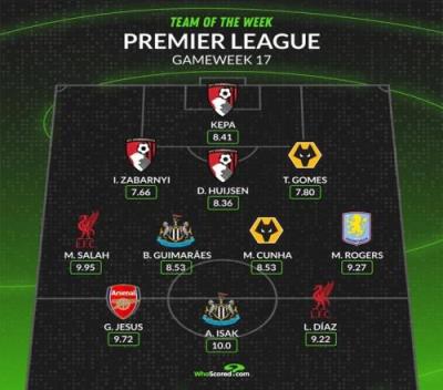 WhoScored英超第17轮最佳阵:萨拉赫领衔,热苏斯、伊萨克在列