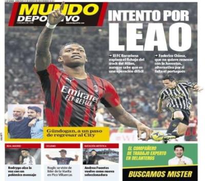 世体头版写道:巴萨追求莱奥。此外头版内容两个副标题写道:尽管知道引进米兰核心球员莱奥会非常艰难,但巴萨正探索签下他的可能性;如果引进莱奥失败,巴萨的备选方案是寻求引进小基耶萨,因为小基耶萨无意与尤文续约。