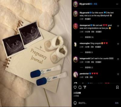 莉莉-杰拉德晒出了自己怀孕的图片,并且配文:我们的小秘密,最好的消息,小小的我们要来了。杰拉德也在这条社媒下回复:“我们等不及了,恭喜,我们爱你。”