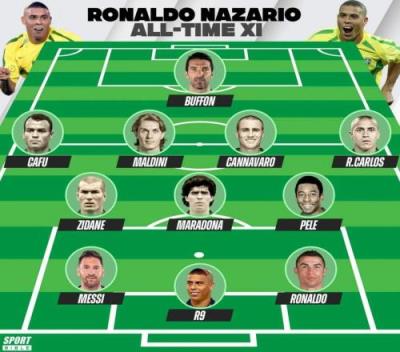 中场:齐达内(法国)、马拉多纳(阿根廷)、贝利(巴西)