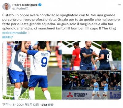 体育资讯7月13日报道宣称 拉齐奥前锋因莫比莱转会贝西克塔斯,队友佩德罗在社交媒体上与他告别。