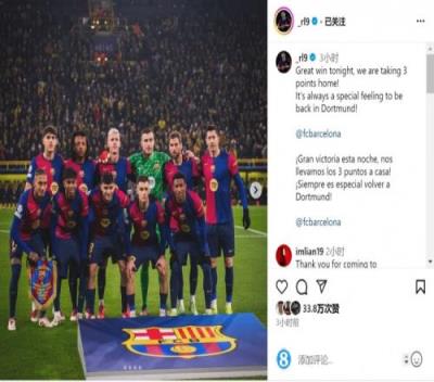 莱万在社交媒体上晒出巴萨首发球员的合照,并写道:“今晚取得了很棒的胜利,我们将三分带回家!”