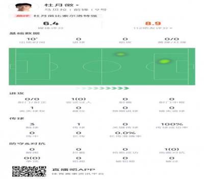 留洋球员杜月徵战马竞数据:出场10分钟触球3次评分6.4分