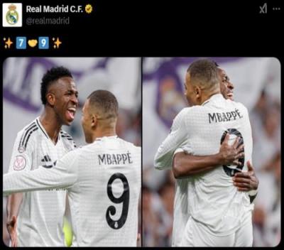 本场比赛姆巴佩与维尼修斯双双取得进球,赛后皇马官推也晒出两人相拥庆祝的照片 ,配文为两人球衣号码7号与9号。