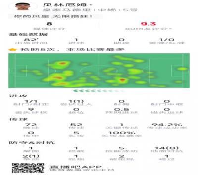 贝林厄姆本场数据:1粒进球,5次抢断,1关键传球,评分8分