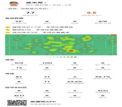 基米希本场4关键传球+7成功长传+5成功对抗+4抢断7.7分全场最高