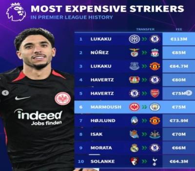 英超历史前锋引援榜:卢卡库、哈弗茨2上榜努涅斯、马尔穆什在列