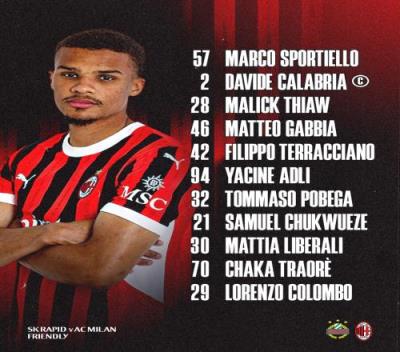 米兰友谊赛对阵维也纳快速首发:卡拉布里亚、丘库埃泽出战
