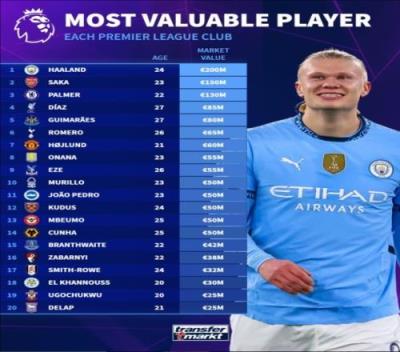 体育资讯12月27日报道宣称 德转列出了英超各队身价最高球员排行榜,哈兰德2亿欧居首,萨卡、帕尔默、迪亚斯、霍伊伦在列。