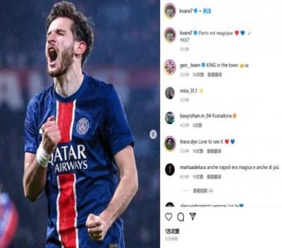 克瓦拉茨赫利亚也在赛后通过社媒晒出自己的庆祝照,并配文:“巴黎充满了魔力。”