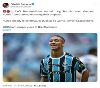 罗马诺指出,布伦特福德对巴西小将努内斯感兴趣,但他们此前的报价未能打动格雷米奥,这家英超俱乐部已经提交改进过后的新报价。