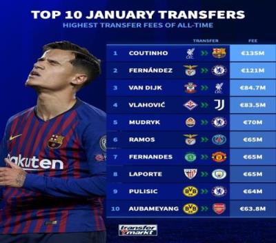 体育资讯1月3日报道宣称 德国转会市场统计了冬窗最贵交易排名,库蒂尼奥1.35亿欧元加盟巴萨居首。