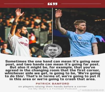 而在此前班福德的说法中,有一些也和王伟所述不谋而合。班福德说道:“有时候,一只手可能表示球会传向近门柱,而两只手可能表示球会传向远门柱。但也可能是,比如你们在更衣室里已经商量好了,第一个角球,不管在哪一侧,我们会采用某种战术。这可能是指,我们会把球传到某个区域,或者集中冲击某个区域。”