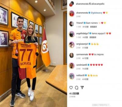 离开米兰就复合莫拉塔社媒晒和妻子手持加拉塔萨雷77号球衣照