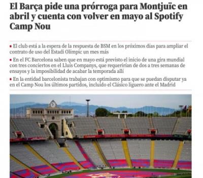 体育资讯1月13日报道宣称 《世界体育报》报道,巴萨正寻求将蒙锥克体育场的使用期限从3月底延长至4月底,同时预计最迟在5月重返诺坎普主场。