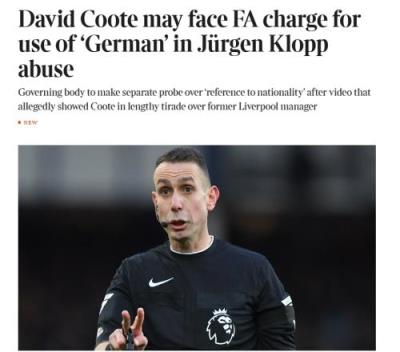 体育资讯11月12日报道宣称 据《泰晤士报》报道,最近陷入“视频门”的英超裁判大卫-库特可能因为辱骂克洛普“德国婊子”而招来英足总严厉的指控。