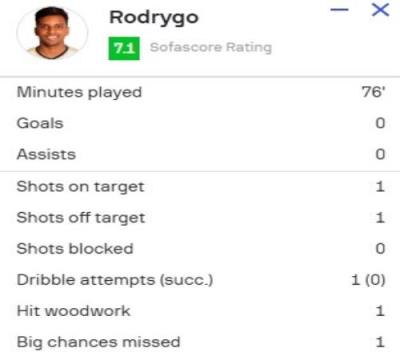 体育资讯8月15日报道宣 皇马在欧超杯2-0领先亚特兰大,罗德里戈本场数据如下: