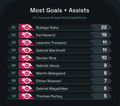 本赛季5名阿森纳球员参与进球10+,萨卡参与22球最多&哈弗茨19球