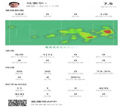 数据方面,马奎尔11次解围,1拦截,2抢断;8次对抗7次成功;1次送点。评分7.5分,在被换下时是除了门将巴因德尔之外评分最高的曼联球员。