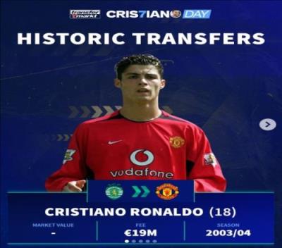 体育资讯2月5日报道宣称 今天是C罗的40岁生日,德转列出C罗生涯至今的转会记录,他一共有过5次转会,总计转会费2.47亿欧元。