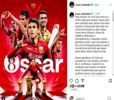 奥斯卡写道:“今天,我结束了一个永远铭刻在我生命中的篇章。在穿上这件球衣并为之骄傲了8年后,说再见时的心情无比复杂,充满了各种情感。这些年充满了努力、奉献,最重要的是,充满了成就。我们一起赢得了所有可以赢得的荣誉,这一切都得益于所有俱乐部成员和球迷们的无私支持。”