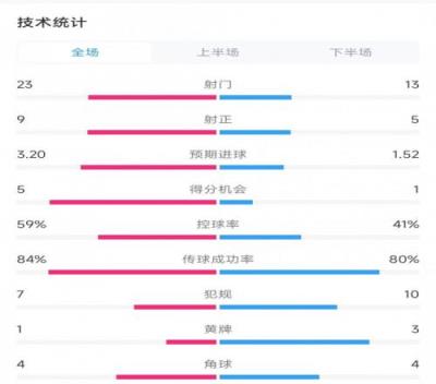 曼联vs南安普顿数据:射门23比13、射正9比5、控球率59%比41%