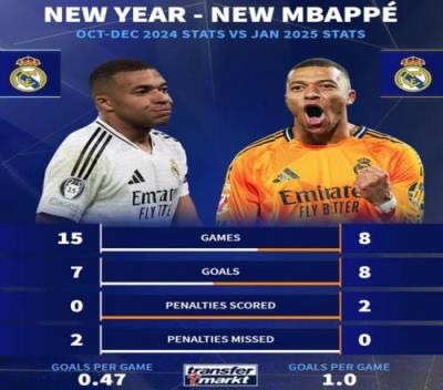 体育资讯1月28日报道宣称 皇马在本轮西甲客场3-0完胜巴拉多利德,姆巴佩上演帽子戏法。《德转》也对比了姆巴佩今年1月和去年最后3个月在皇马的关键数据: