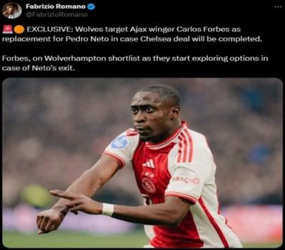 罗马诺表示:“如果切尔西引进佩德罗-内托,那么狼队将把阿贾克斯边锋卡洛斯-福布斯-博尔赫斯视作替代者。”