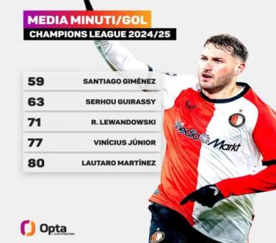 体育资讯1月31日报道宣称 米兰当前正在求购费耶诺德中锋圣地亚哥-希门尼斯,数据统计显示后者也是本赛季欧冠效率最高的射手。