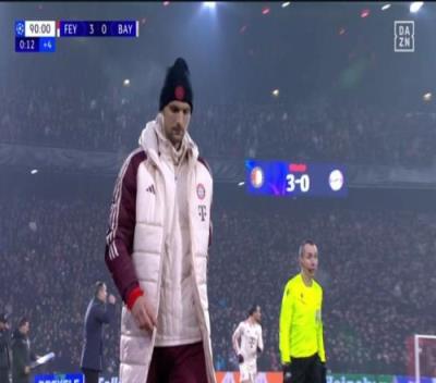 体育资讯1月23日报道宣称 在北京时间今天凌晨进行的欧冠联赛阶段第7轮比赛中,拜仁在客场0-3不敌费耶诺德。在比赛进行到最后阶段,替补门将乌尔赖希被红牌罚下场,德媒《图片报》表示这是因为他当面抱怨当值裁判执行双重标准。
