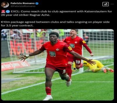 罗马诺:科莫和凯泽斯劳滕达成协议,将1000万欧引进中锋阿彻