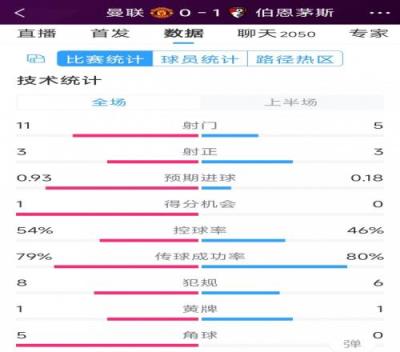 红魔一球落后,曼联vs伯恩茅斯半场数据:射门115,射正33