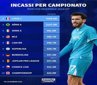 目前冬窗各联赛转会收入排名:法甲居首,巴甲、意甲二三位